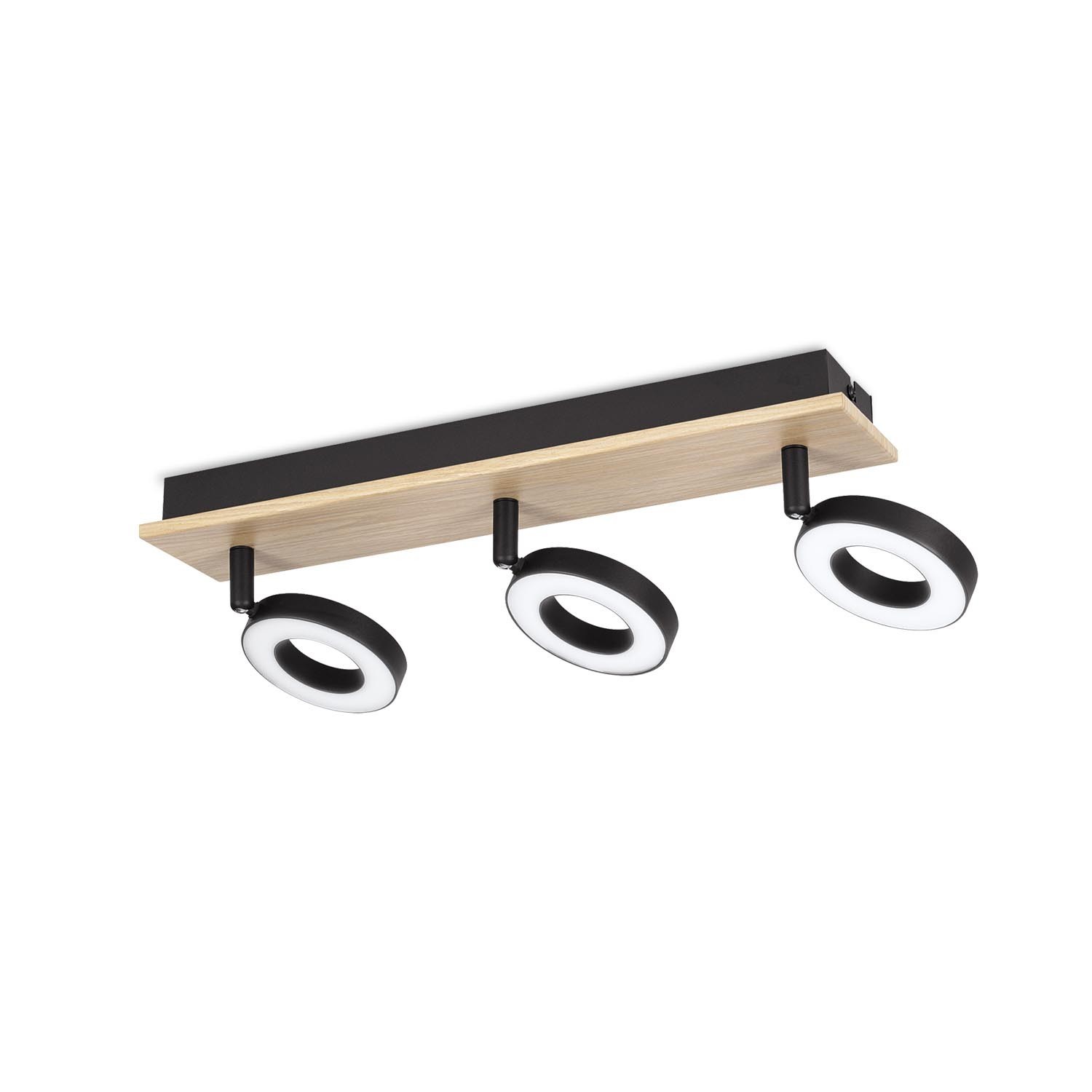 Línea de apliques LED que se pueden colocar en techo o pared, combina madera con detalles en color negro.